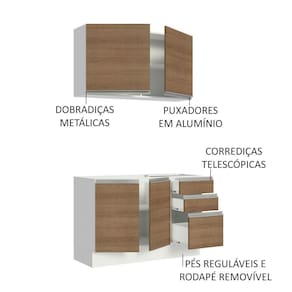 O acabamento da cozinha é Branco. As portas e frentes são em amadeirado Rustic, e as partes internas das gavetas e das costas, são brancas. Feito em Pintura Poliéster ecológica, com aplicação de 7 camadas de proteção resistentes a álcool, água e calor.