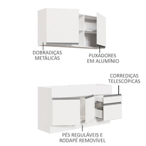 Fabricada com itens de qualidade, possui puxadores com perfil total em alumínio, dobradiças que amortecem o fechamento das portas e corrediças telescópicas que permitem a abertura total das gavetas.