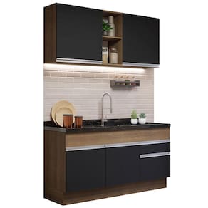 O acabamento da estrutura é no padrão amadeirado Rustic. As portas e frentes são pretas. As partes internas das costas e das gavetas são brancas. O processo é feito em Pintura Poliéster com 7 camadas de proteção resistentes a álcool, água e calor.