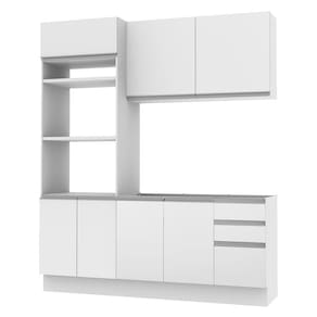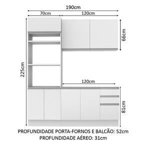 Outro grande diferencial desta cozinha é a profundidade maior, como uma cozinha planejada: 52 cm no paneleiro e balcão inferior e 31 cm no aéreo. As medidas totais da Cozinha Madesa Laura são: 190 cm de largura e 225 cm de altura.