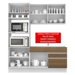 Outro grande diferencial desta cozinha é a profundidade maior, como uma cozinha planejada: 52 cm no balcão inferior e 31 cm nos aéreos. As medidas totais da Cozinha Madesa Lívia são: 190 cm de largura e 225 cm de altura.