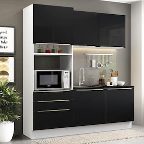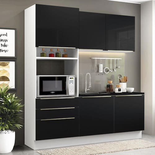 O acabamento da estrutura é branco e as portas e as frentes das gavetas são pretas. É feito em Pintura Poliéster com aplicação de 7 camadas de proteção resistentes a álcool, água e calor.