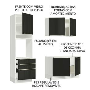 O grande destaque são as portas e gavetas, que recebem um vidro preto aplicado, detalhe que traz muita elegância ao ambiente.