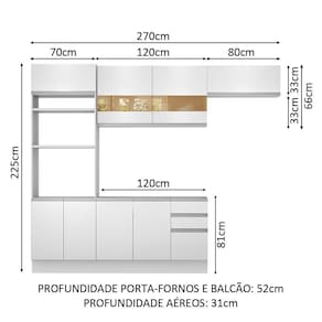 Outro grande diferencial desta cozinha é a profundidade maior, como uma cozinha planejada: 52 cm no balcão inferior e 31 cm nos aéreos. As medidas totais da Cozinha Madesa Marselha são: 270 cm de largura e 225 cm de altura.
