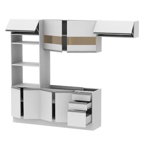 Sua distribuição é ideal para quem precisa de um espaço organizado de forma inteligente e funcional. Tem lugar para fogão e depurador, além de espaço para toda a louça, panelas, utensílios e as compras do mês. A torre possui espaço para forno e micro-ondas e permite a instalação de forno embutido.