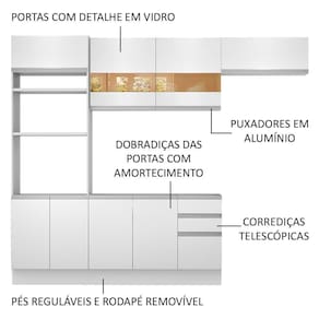 As gavetas possuem corrediça telescópica e todas as portas possuem amortecedor para o fechamento suave. Os puxadores são em alumínio e o aéreo possui detalhe em vidro reflex que traz modernidade ao ambiente.