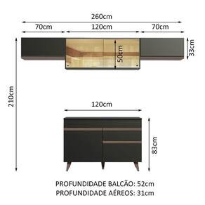 As medidas totais são: 260 cm de largura e profundidade de 52 cm no balcão e 31 cm nos aéreos. A altura sugerida com base na linha é de 210 cm.