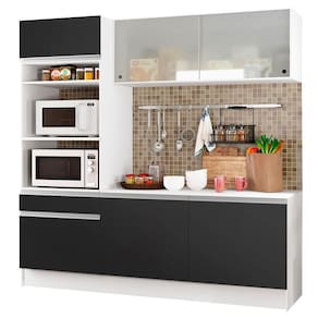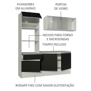 O acabamento interno e externo é branco. As portas e a frente da gaveta são pretas. A Pintura em Poliéster Protetor consiste na aplicação de 7 camadas de proteção resistentes a álcool, água e calor. Além disso, o processo é ecológico, isento de vapores que vão para a atmosfera.