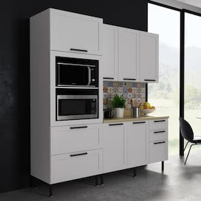 Esta cozinha compacta conta com um total de 6 portas (uma delas basculante com pistão a gás) e 5 gavetas com corrediças telescópicas, proporcionando máxima praticidade e funcionalidade. As dobradiças das portas possuem amortecedor Slow Motion para um fechamento suave e silencioso. O balcão conta com tampo removível (BP) de 30mm e é com pia de 120cm. Além disso, o paneleiro oferece áreas dedicadas para colocação de forno e micro-ondas (até 7kg cada), otimizando o espaço do ambiente.