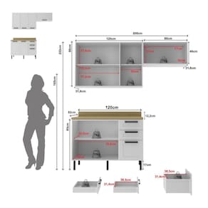 Esta cozinha compacta conta com um total de 6 portas (uma delas basculante com pistão a gás) e 3 gavetas com corrediças telescópicas, proporcionando máxima praticidade e funcionalidade. As dobradiças das portas possuem amortecedor Slow Motion para um fechamento suave e silencioso. O balcão conta com tampo removível (BP) de 30mm e é com pia de 120cm, oferecendo diferentes opções de utilização.