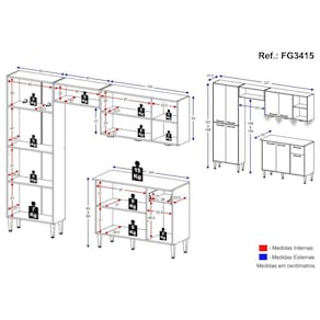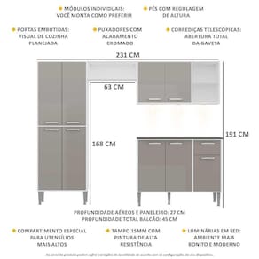 Cozinha: Altura: 191 cm | Largura: 231 cm | Profundidade: 27,5 cm (aéreos e paneleiro) - 45 cm (balcão com tampo)