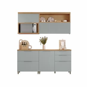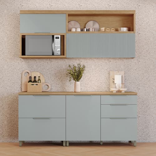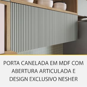 Armário aéreo com toque de milão O armário aéreo de 120 cm é uma peça de destaque, com sua porta articulada canelada que segue a tendência de Milão, Itália. Este design traz aconchego, beleza e harmonia ao conjunto, fazendo da sua cozinha um espaço convidativo e elegante.