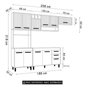 Na parte superior o Armário Aéreo traz ainda mais funcionalidade, com três portas, um nicho para temperos e um nicho adega com três compartimentos. Já o Armário de Geladeira completa a composição com uma porta basculante com pistão a gás, proporcionando um movimento suave e controlado. Com três prateleiras internas, a Cozinha Compacta possui amplo espaço para armazenar seus utensílios e mantimentos de forma pratica e eficiente.