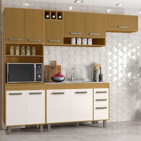O Paneleiro foi desenvolvido para otimizar o espaço, contando com quatro portas e um nicho para micro-ondas ou forno elétrico, além nicho decorativo perfeito para expor seus itens favoritos. O Balcão de Cozinha vem com três portas e duas gavetas, garantindo muito mais organização no dia a dia. A Pia Inox se destaca pelo excelente desempenho no escoamento da água, além de ter uma superfície ideal para apoiar diversos objetos e auxiliar no preparo dos alimentos.