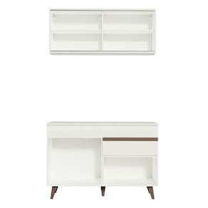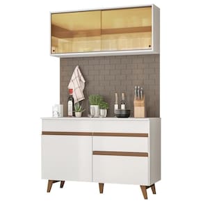 O acabamento da cozinha é branco, feito em Pintura Poliéster ecológica de alta resistência, que dá maior destaque à tonalidade e protege o móvel dos efeitos da água e do calor. As medidas totais são: 120 cm de largura e 210 cm de altura. A profundidade é de 52 cm no balcão e 31 cm no aéreo.