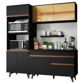 O acabamento da cozinha é preto, com exceção das partes internas das gavetas e das costas, que são brancas. O processo é feito em Pintura Poliéster ecológica de alta resistência, que dá maior destaque à tonalidade e protege o móvel.