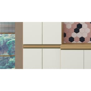 Cozinha com três peças, Armário com Nicho, Paneleiro Duplo , Armário Refrigerador. Produzido em MDP de 15mm e 12mm de espessura, proporcionando resistência e durabilidade. Amplo espaço interno, garantindo maior firmeza ao móvel. Puxadores de PVC dando maior resistência. Dobradiças metálicas dando maior durabilidade e resistência ao abrir e fechar as portas. Acabamento em verniz texturizado fosco e verniz brilho nas portas, garantindo a conservação do móvel, além de manter a beleza constante oferece ao móvel, resistência e durabilidade prolongando a vida útil do produto.