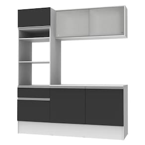 - 1 torre com nichos para forno e micro-ondas, com 1 gaveta e 2 portas, sendo uma basculante com 1 balcão agregado de 120 cm com 2 portas