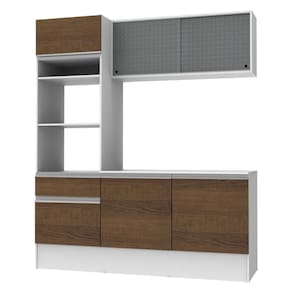 - 1 torre com nichos para forno e micro-ondas, com 1 gaveta e 2 portas, sendo uma basculante com 1 balcão agregado de 120 cm com 2 portas