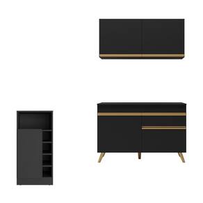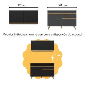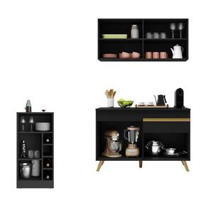 Cozinha Compacta Com Bancada Americana 1 Porta Veneza Multimóveis Mp2207 Preto/dourado Preto/dourado A Cozinha Compacta com Bancada Americana 1 Porta Veneza Multimóveis MP2207 é a solução ideal para quem busca praticidade e beleza na decoração da cozinha. Produzida em MDP com acabamento acetinado (cerca de 20% de brilho), garante durabilidade e um toque de elegância. Com 4 portas, sendo a menor basculante, e 1 gaveta com corrediças metálicas, que proporcionam mais leveza no manuseio, a cozinha possui amplo espaço interno para organização dos seus itens. Além disso, os pés retrô em polipropileno oferecem um design charmoso ao móvel. Os tampos de 15mm do balcão (suporta até 15kg) e da bancada (suporta até 20kg) são resistentes. Os módulos individuais permitem flexibilidade na montagem, adaptando-se perfeitamente ao seu espaço. Versátil, o balcão conta com tampo removível (compatível com pia de 120cm) e um compartimento especial para utensílios mais altos. Já a bancada possui 1 porta, prateleira interna e adega embutida, para acomodar bebidas e itens mais utilizados no dia a dia, além de poder ser utilizada como divisora de ambientes. Conteúdo da Embalagem: 1 (um) Armário Aéreo 120cm 1 (um) Balcão com Tampo 120cm 1 (uma) Bancada/Mesa Manual de Montagem Kit Ferragem