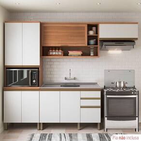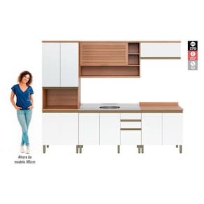 A Cozinha Completa Macadâmia é garantia de qualidade, durabilidade e encanto para a sua casa. Nesta configuração, ela possui cinco módulos amplos e muito funcionais, que remetem à estética visual dos móveis planejados. A qualidade dos componentes é destaque aqui: as portas possuem dobradiças com caneco de 35mm e sistema de amortecimento slow motion – para garantir movimentos mais suaves na abertura e fechamento; as portas basculantes são equipadas com pistão a gás - componente que garante sustentação e segurança na usabilidade. As gavetas contam com corrediças telescópicas – sinônimo de firmeza, deslizamento mais suave e abertura de extração total – e divisor de talheres. O Paneleiro possui espaço reservado para forno ou micro – eletros muito utilizados que precisam estar sempre ao alcance. A bela porta basculante ripada, ao famoso estilo veneziano, e os nichos para acomodar itens especiais do Armário Aéreo de 1,20m, trazem aquele toque de tendência e estilo. Essa composição se torna ainda mais completa com os dois Balcões – incluindo a versão para pia - itens indispensáveis para a rotina. Uma cozinha ampla, bonita e resistente - pronta para levar para casa.