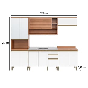 Medida de cada item (A x L x P): Balcão: 92 cm x 80 cm x 52 cm; Balcão: 84 cm x 120 cm x 50,5 cm; Paneleiro: 217 cm x 70 cm x 52 cm; Armário: 36 cm x 80 cm x 31 cm; Armário: 72,5 cm x 120 cm x 31 cm;