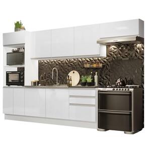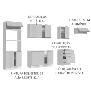 O acabamento da estrutura é branco fosco e as portas e frentes são em branco brilhante. É feito em Pintura Poliéster ecológica de alta resistência, que confere maior durabilidade e durabilidade ao móvel e oferece proteção contra os efeitos da água e do calor.