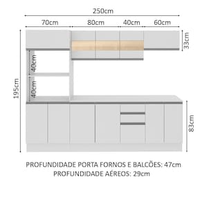 Para completar, o acabamento é em pintura poliéster de alta resistência e fácil limpeza que confere beleza e praticidade. Disponível nas opções totalmente branca ou internamente branca e com as portas em crema e amadeirado Rustic com toque de madeira natural. As medidas totais são: 250 cm de largura e 195 cm de altura; profundidade de 47 cm nos balcões e paneleiro e de 27 cm nos aéreos.
