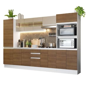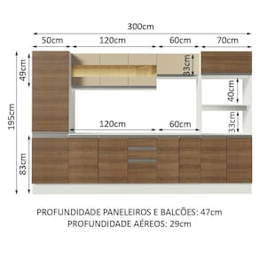 Para completar, o acabamento é em pintura poliéster de alta resistência e fácil limpeza que confere beleza e praticidade. Disponível nas opções totalmente branca ou internamente branca e com as portas em crema e amadeirado Rustic com toque de madeira natural. As medidas totais são: 300 cm de largura e 195 cm de altura; profundidade de 47 cm nos balcões e paneleiro e de 27 cm nos aéreos.