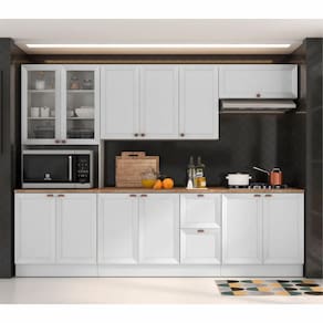 Informações Complementares: Balcão 1,20m pode ser utilizado para pia, Balcão 0,80m com prateleira removível para acomodar objetos maiores e tampo pode ser recortado para uso de cooktop, dobradiças 35mm, corrediças telescópicas, portas e frente de gavetas molduradas em MDF, produto em MD