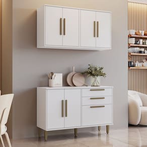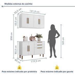 Cabem muitos itens no conjunto de armários para cozinha? Nosso armário para cozinha vem com prateleiras e portas grandes e espaçosas. Acabamento da Prateleira: Pintura Escala de Brilho da Prateleira: Semi-Brilho Acabamento da Gaveta: Pintura Escala de Brilho da Gaveta: Semi-Brilho Material do Puxador da Gaveta: MDF Acabamento da Porta: Pintura Escala de Brilho da Porta: Semi-Brilho Material do Puxador da Porta: MDF Acabamento: Pintura UV Acabamento dos Pés: Pintura Acompanha Rodapé Decorativo: Não Acompanha Tampo: Sim Altura dos Pés: 17 cm Ambiente Principal: Cozinha Balcão Suporta Pia: Não codigo_ean: 7900288072283 Complexidade da Montagem: Baixa: pode ser montado por uma pessoa sozinha Cor: Branco Cor do Produto: Branco Cor Interna: Branco Escala de Brilho: Semi-Brilho Espessura do Material da Estrutura: 1,5 mm Espessura do Tampo: 15 mm Gaveta com Chave: Não Itens Inclusos: 1 Cozinha completa, 1 Kit de Ferragens e 1 Manual de Montagem. Manual de Montagem e Instalação: https://cdn2.madeiramadeira.com.br/prd/kaiki-moveis/2691206-1739555056-978303-149261.pdf Marca: Kaiki Móveis Material da Corrediça: Aço Material da Dobradiça/Corrediça da Porta: Aço Material da Gaveta: MDP Material da Porta: MDP Material da Prateleira: MDP Material do Fundo: HDF Material do Tampo: MDP Material dos Pés: Plástico Medida de cada item (A x L x P): 2 Aereos: 63,5cmx60,75cmx33,5cm 1 Balcão 3 Portas: 80,5cmx119,5cmx43cm Necessita Montagem: Sim O Balcão Acompanha Pia: Não Origem do Produto: Nacional Pés Reguláveis: Sim Peso: 64,5 kg Peso Máximo por Gaveta: 5 kg Peso Máximo por Prateleira: 10 kg Possui Pés: 05 Possui Portas: Sim Possui Prateleiras: Sim Possui recorte para Cooktop: Não Possui Rodízio: Não Recomendações de Uso, Manutenção e Limpeza: Limpar com flanela limpa e seca. Não usar produtos abrasivos. Sapatas Niveladoras: Sim Sistema de Montagem: Parafusos, Minifix, Cavilha, Pregos Suporta Até (kg): 55 kg Tipo de Corrediça da Gaveta: Telescópica Tipo de Dobradiça da Porta: Simples Tipo de Porta: Bater Tipo de Puxador da Gaveta: Externo Tipo de Puxador da Porta: Externo