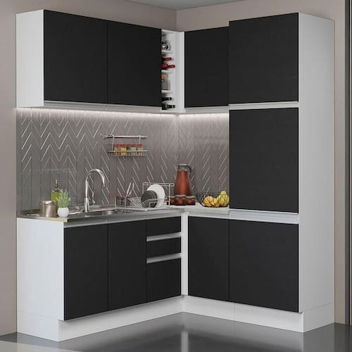 O acabamento da estrutura é em amadeirado Rustic. As portas são pretas e as partes internas das costas e das gavetas são brancas. É feito em Pintura Poliéster com 7 camadas que protegem o móvel dos efeitos do álcool da água e do calor.