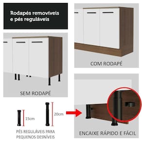 Para completar, a cozinha conta com pés reguláveis em PVC e rodapé removível em MDP de fácil encaixe, para retirar na hora de realizar a limpeza.