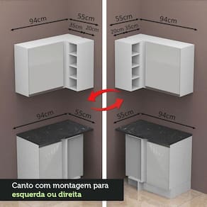 Um grande diferencial é que a cozinha é modulada. Com isso, é possível fazer a disposição dos armários e balcões conforme a necessidade do seu ambiente. Além disso, o canto pode ser montado para o lado direito ou esquerdo.