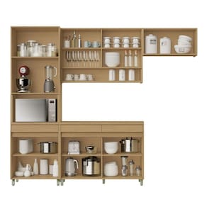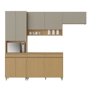 Chega de sofrencia na sua cozinha! Nosso conjunto vai chegar no seu ambiente, levando tendência, inovação e muito estilo em cada detalhe, com funcionalidades que transformam o seu dia a dia. Os aéreos vão guardar tudo o que você precisar (e olha que cabe coisa, hein) na altura certa, para facilitar na correria do dia. O paneleiro é um show à parte, com espaço especial para micro-ondas, ele vai fazer qualquer visita virar fã número 1 da sua cozinha. Com o fundo feito de chapa Duratree, o kit se torna combo perfeito de espaço e qualidade. Acabamento da Prateleira: Impressão Escala de Brilho da Prateleira: Semi-Brilho Acabamento da Gaveta: Impressão Escala de Brilho da Gaveta: Semi-Brilho Acabamento da Porta: Impressão Escala de Brilho da Porta: Semi-Brilho Acompanha Tampo: Sim Altura dos Pés: 10 cm Ambiente Principal: Cozinha Complexidade da Montagem: Alta: deve ser montado por um montador especializado Cor: Carvalho/Greige Cor do Produto: Carvalho/Greige Escala de Brilho: Semi-Brilho Gaveta com Chave: Não Informações Complementares: Tampo 30mm; dobradiça 35mm e conforto tecnológico slow motion; Fundo dos armários de Duratree,produto super-resistente e anti-mofo. Itens Inclusos: 1 Cozinha, 1 Manual de Montagem e 1 Kit Ferragens. Manual de Montagem e Instalação: https://product-hub-prd.madeiramadeira.com.br/952313/documents/fa8bcde6-b084-4f33-8462-6818fb844ae423747217321727206706641.pdf Material da Dobradiça/Corrediça da Porta: Metálica Material da Gaveta: MDF Material da Porta: MDF Material da Prateleira: MDF Material do Fundo: Duratree Material do Tampo: MDF Material dos Pés: Plástico Medida de cada item (A x L x P): Paneleiro: 228x54,5x70; aéreo com nicho: 80x32x120; aéreo geladeira: 40x32x80; balcao 2 portas: 91x54,5x120 Necessita Montagem: Sim O Balcão Acompanha Pia: Não Origem do Produto: Nacional Pés Reguláveis: Sim Peso: 185 kg Peso Máximo por Gaveta: 5 kg Peso Máximo por Prateleira: 10 kg Possui Pés: 09 Possui Portas: Sim Possui Prateleiras: Sim Possui recorte para Cooktop: Não Possui Rodízio: Não Recomendações de Uso, Manutenção e Limpeza: Utilizar pano macio levemente umedecido e na sequencia pano macio seco. Sapatas Niveladoras: Sim Sistema de Montagem: Parafusos e Cavilhas Suporta Até (kg): 165 kg Tipo de Corrediça da Gaveta: Telescópica Tipo de Dobradiça da Porta: 35 mm Tipo de Puxador da Gaveta: Embutido Tipo de Puxador da Porta: Embutido