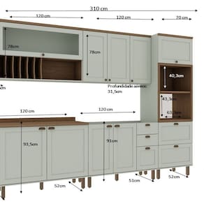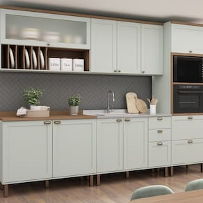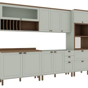 Renove sua cozinha com praticidade e elegância! Entre em contato e adquira já a sua! Acabamento da Prateleira: Pintura Escala de Brilho da Prateleira: Fosco Acabamento da Gaveta: Pintura Escala de Brilho da Gaveta: Fosco Material do Puxador da Gaveta: ABS Acabamento da Porta: Pintura Escala de Brilho da Porta: Fosco Material do Puxador da Porta: ABS Acabamento dos Pés: Pintura Acompanha Rodapé Decorativo: Não Acompanha Tampo: Sim Altura dos Pés: 17 cm Altura Máxima dos Pés: 17.0000 Ambiente Principal: Cozinha Balcão Suporta Pia: Sim codigo_ean: 7900288175649 Complexidade da Montagem: Média: pode ser montado por mais de uma pessoa e/ou necessite de maior conhecimento para montagem Cor: Verde Mint/Ébano Cor do Produto: Verde Mint/Ébano Cor Flex: Não Cor Interna: Mint Escala de Brilho: Fosco Espessura do Material da Estrutura: 15 mm Espessura do Tampo: 25 mm Gaveta com Chave: Não Informações Complementares: Cozinha Completa Modulada 5 Módulos 100% MDF 10 Portas Provençal/internacional Itens Inclusos: 1 Cozinha Completa, Kit Ferragens e Manual de Montagem Linha ou Coleção: Iluminata Manual de Montagem e Instalação: https://product-hub-prd.madeiramadeira.com.br/325178188/documents/51e658e3-f841-43d1-9412-3d1fd41928e229940867341749753260254.pdf Marca: Genialflex Material da Corrediça: Metálica Material da Dobradiça/Corrediça da Porta: Metálica Material da Gaveta: MDF Material da Porta: MDF Material da Prateleira: MDF Material do Fundo: mdf Material do Tampo: MDF Material dos Pés: ABS Medida de cada item (A x L x P): Balcão 2Portas(93,5x120x52)Aéreo Porta de Vidro (78x120x31,5) Balcão 2P 3 Gavetas (91x120x51) Aereo 3 Portas ( 78x120x31,5) Torre Forno e Micro ( 230x70x52) modular: Sim Montagem Flex: Sim, os módulos podem ser posicionados em lugares diferentes. Necessita Montagem: Sim O Balcão Acompanha Pia: Não Origem do Produto: Nacional Pés Reguláveis: Sim Peso: 220,92 kg Peso Máximo por Gaveta: 5 kg Peso Máximo por Prateleira: 5 kg Possui Pés: 14 Possui Porta com Vidro: Sim Possui Portas: Sim Possui Prateleiras: Sim Possui recorte para Cooktop: Não Possui Rodízio: Não Possui Vidro: Sim Produto Montado: Sim Recomendações de Uso, Manutenção e Limpeza: Limpar com Pano Umedecido e Numerodas Peças Retirar com Alcool Sapatas Niveladoras: Sim Sistema de Montagem: Parafusos e Cavilhas e minifix Suporta Até (kg): 70 kg Tamanho Indicado da Pia: 120 Tipo de Corrediça da Gaveta: Metálica Telescópica Tipo de Dobradiça da Porta: Soft close Tipo de Puxador da Gaveta: Externo Tipo de Puxador da Porta: Externo