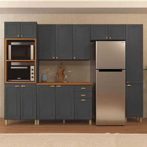 A cozinha Paris da Indekes, possuí sua estrutura em chapas de MDP 15mm e portas/gavetas em MDF 15mm, o que garante sua qualidade e durabilidade. Possuí puxadores em metal, que são muito resistentes. Com design inovador e inspirado no estilo americano, a cozinha foi feita para você que está procurando aliar a funcionalidade com a elegância, com um móvel que exalta qualquer ambiente. Acabamento da Prateleira: Pintura Escala de Brilho da Prateleira: Fosco Acabamento da Gaveta: Pintura Escala de Brilho da Gaveta: Fosco Material do Puxador da Gaveta: Metal Acabamento da Porta: Pintura Escala de Brilho da Porta: Fosco Material do Puxador da Porta: Metal Acabamento: Pintura UV Acompanha Tampo: Sim Altura dos Pés: 14 Ambiente Principal: Cozinha Complexidade da Montagem: Alta: deve ser montado por um montador especializado Cor: Cinza Cor do Produto: Cinza Cor Interna: Cinza Escala de Brilho: Fosco Gaveta com Chave: Não Itens Inclusos: 1 Torre Quente, 2 Armários, 1 Balcão, 1 Paneleiro, Kit Ferragens e Manual de Montagem Linha ou Coleção: Paris Manual de Montagem e Instalação: https://cdn2.madeiramadeira.com.br/atributo/moveis-indekes/1280588-6171-107-manual.pdf Material da Dobradiça/Corrediça da Porta: Metálica Material da Gaveta: MDF Material da Porta: MDF Material da Prateleira: MDP Material do Tampo: MDF Material dos Pés: Plástico Medida de cada item (A x L x P): Torre Quente: 226x70x51,5cm | Armário 120cm: 81x120x32cm | Balcão 120cm com Tampo: 93x120x53cm | Armário 80cm: 36x80x32cm | Paneleiro Simples: 226x40x32cm Montagem Flex: Não Necessita Montagem: Sim O Balcão Acompanha Pia: Não Origem do Produto: Nacional Pés Reguláveis: Sim Peso: 172 Peso Máximo por Gaveta: 3 Peso Máximo por Prateleira: 5 Possui Pés: 13 Possui Portas: 14 Possui Prateleiras: 08 Possui recorte para Cooktop: Não Possui Rodízio: Não Recomendações de Uso, Manutenção e Limpeza: Não limpar com álcool ou qualquer outro produto quimico. Utilize somente pano seco ou levemente umedecido. Sapatas Niveladoras: Não Sistema de Montagem: Cavilhas, Parafusos, Minifix Suporta Até (kg): 30 Tamanho Indicado da Pia: 120x53cm Tipo de Corrediça da Gaveta: Telescópica Tipo de Dobradiça da Porta: Soft close Tipo de Porta: Bater Tipo de Puxador da Gaveta: Externo Tipo de Puxador da Porta: Externo