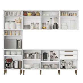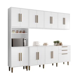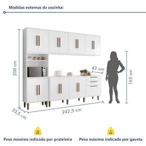 Cabe bastante coisa no conjunto de armários para cozinha? Nosso armário para cozinha vem com prateleiras e portas grandes e espaçosas. Acabamento da Prateleira: Pintura Escala de Brilho da Prateleira: Semi-Brilho Acabamento da Gaveta: Pintura Escala de Brilho da Gaveta: Semi-Brilho Material do Puxador da Gaveta: MDF Acabamento da Porta: Pintura Escala de Brilho da Porta: Semi-Brilho Material do Puxador da Porta: MDF Acabamento: Pintura UV Acabamento dos Pés: Pintura Acompanha Rodapé Decorativo: Não Acompanha Tampo: Sim Altura dos Pés: 17 cm Ambiente Principal: Cozinha Balcão Suporta Pia: Não codigo_ean: 7900288070685 Complexidade da Montagem: Baixa: pode ser montado por uma pessoa sozinha Cor: Branco Cor do Produto: Branco Cor Interna: Branco Escala de Brilho: Semi-Brilho Espessura do Material da Estrutura: 1,5 mm Espessura do Tampo: 15 mm Gaveta com Chave: Não Itens Inclusos: 1 Cozinha Completa + Kit de Ferragens + Manual de Montagem. Manual de Montagem e Instalação: https://cdn2.madeiramadeira.com.br/prd/kaiki-moveis/2691204-1739555056-978291-149271.pdf Marca: Kaiki Móveis Material da Corrediça: Aço Material da Dobradiça/Corrediça da Porta: Aço Material da Gaveta: MDP Material da Porta: MDP Material da Prateleira: MDP Material do Fundo: HDF Material do Tampo: MDP Material dos Pés: Plástico Medida de cada item (A x L x P): 1 Paneleiro: 208cmx60,75cmx33,5cm; 3 Aereos: 63,5cmx60,75cmx33,5cm 1 Balcão 5 Portas: 80,5cmx178,4cmx43cm Necessita Montagem: Sim O Balcão Acompanha Pia: Não Origem do Produto: Nacional Pés Reguláveis: Sim Peso: 133,5 kg Peso Máximo por Gaveta: 5 kg Peso Máximo por Prateleira: 10 kg Possui Pés: 12 Possui Portas: Sim Possui Prateleiras: Sim Possui recorte para Cooktop: Não Possui Rodízio: Não Recomendações de Uso, Manutenção e Limpeza: Limpar com flanela limpa e seca. Não usar produtos abrasivos. Sapatas Niveladoras: Sim Sistema de Montagem: Parafusos, Minifix, Cavilha, Pregos Suporta Até (kg): 100 kg Tipo de Corrediça da Gaveta: Telescópica Tipo de Dobradiça da Porta: Simples Tipo de Porta: Bater Tipo de Puxador da Gaveta: Externo Tipo de Puxador da Porta: Externo