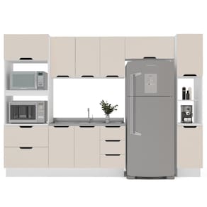 A cozinha 5 peças Meena da Politorno Móveis é a solução ideal para quem busca praticidade e elegância. Com 224,5 cm de altura, 310 cm de largura e 52 cm de profundidade, ela conta com 1 balcão com 3 gavetas e 2 portas, 1 torre quente, 1 paneleiro, 3 armários aéreos e 1 armário aéreo basculante, oferecendo amplo espaço para organizar utensílios, eletrodomésticos e mantimentos. O design moderno e sofisticado, aliado a materiais de alta qualidade, proporciona um ambiente funcional e estiloso. As corrediças telescópicas garantem abertura suave das gavetas, enquanto o acabamento em pintura UV oferece durabilidade e resistência. O tampo não acompanha o produto, permitindo personalização conforme sua necessidade. Possui rodapé.