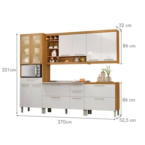 Medida de cada item (A x L x P): 01 armario aereo 120 cm x 86,2 cm x 32 cm, 01 armário aéreo 80 cm x 86,2 cm x 32 cm, 01 balcão com tampo 120 cm x 86 cm x 52,5 cm, 01 balcao com tampo 80 cm x 86 cm x 52,5 cm, 01 paneleiro nicho forno 70 cm x 221 cm x 52 cm.