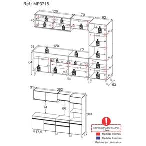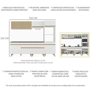 Dimensões do produto montado: Altura: 203cm | Largura: 252cm | Profundidade: 31cm (aéreos) - 53cm (paneleiro e balcão com tampo) *Você pode consultar as medidas internas na imagem técnica do produto.