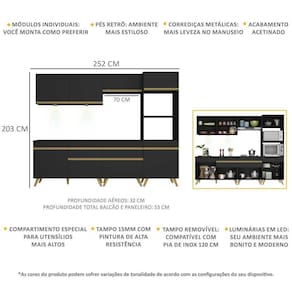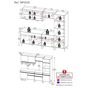 Altura: 203cm | Largura: 252cm | Profundidade: 32cm (aéreos) - 53cm (balcão com tampo e paneleiro)
