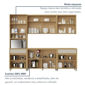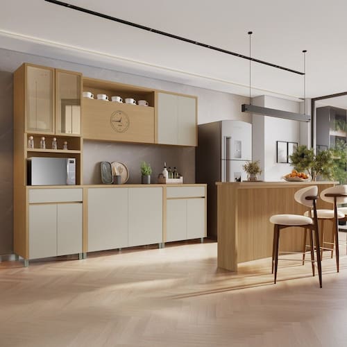 É adequada para decoração de cozinha grande? Sim, é perfeita para quem tem mais espaço e quer aproveitar cada canto da cozinha. Acabamento da Prateleira: Impressão Escala de Brilho da Prateleira: Semi-Brilho Acabamento da Gaveta: Impressão Escala de Brilho da Gaveta: Semi-Brilho Acabamento da Porta: Impressão Escala de Brilho da Porta: Semi-Brilho Acabamento dos Pés: Impressão Acompanha Tampo: Sim Altura dos Pés: 10 cm Altura Máxima dos Pés: 10.0000 Ambiente Principal: Cozinha Balcão Suporta Pia: Não codigo_ean: 7900288102195 Complexidade da Montagem: Alta: deve ser montado por um montador especializado Cor: Carvalho/Greige Cor do Produto: Carvalho/Greige Escala de Brilho: Semi-Brilho Gaveta com Chave: Não Itens Inclusos: 1 Cozinha, 1 Manual de Montagem, 1 Kit Ferragens. Manual de Montagem e Instalação: https://product-hub-prd.madeiramadeira.com.br/983201/documents/f178d79b-f730-4346-b39c-fd633572c3f4276934273217431010965162.pdf Marca: Nesher Móveis Material da Corrediça: Metálica Material da Dobradiça/Corrediça da Porta: Metálica Material da Gaveta: MDF Material da Porta: MDF Material da Prateleira: MDF Material do Tampo: MDF Material dos Pés: Plástico Medida de cada item (A x L x P): Paneleiro: 228x52x70 ; aéreo com relogio: 78x32x120;aéreo 2 portas: 78x32x80;balcao 2 portas: 91x52,5x120; balcao 2 portas 1 gaveta: 91x52x80;ilha:100x200x34,5 Necessita Montagem: Sim O Balcão Acompanha Pia: Não Origem do Produto: Nacional Pés Reguláveis: Sim Peso: 250,47 kg Peso Máximo por Gaveta: 5 kg Peso Máximo por Prateleira: 10 kg Possui Pés: 13 Possui Portas: Sim Possui Prateleiras: Sim Possui recorte para Cooktop: Não Possui Rodízio: Não Possui Vidro: Sim Produto Montado: Sim Recomendações de Uso, Manutenção e Limpeza: Utilizar pano macio levemente umedecido e na sequencia pano macio seco. Sapatas Niveladoras: Sim Sistema de Montagem: Parafusos e Cavilhas Tipo de Corrediça da Gaveta: Metálica Telescópica Tipo de Dobradiça da Porta: 35 mm Tipo de Puxador da Gaveta: Embutido Tipo de Puxador da Porta: Embutido Marca: Não Informado