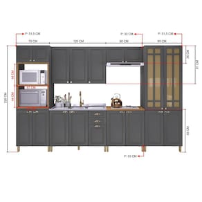 Medida de cada item (A x L x P): Torre Quente: 226x70x51,5cm | Armário 120cm: 81x120x32,5cm | Balcão 120cm sem Tampo: 93x120x53cm | Armário 80cm: 36x80x32cm | Balcão 80cm: 93x80x53cm | Paneleiro Duplo: 226x80x51,5cm