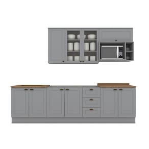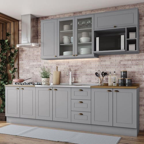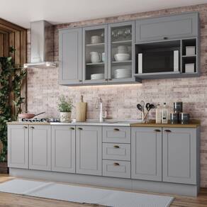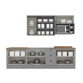 Itens Inclusos: 1 Balcão 3 Gavetas 2 Portas, 1 Aéreo 1 Porta Basculante, 1 Balcão 2 Portas, 1 Balcão 2 Portas com Tampo, 1 Aéreo 3 Portas de Vidro, 1 Aéreo Microondas, Kit Ferragens e Manual de Montagem