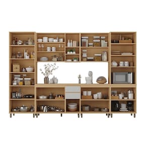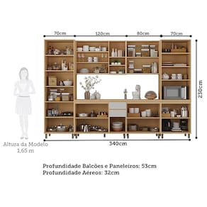 Ambiente composto por: -A x L x P- 1 Cristaleira 70cm 2 Portas com Vidro -230 x 70 x 53- 1 Armário Aéreo 120cm 2 Portas com Nicho -80 x 120 x 32- 1 Armário Aéreo 80cm 2 Portas -80 x 80 x 32- 1 Tampo para Balcão 120cm -2,5 x 120 x 53- 1 Balcão de Cozinha para Pia 120cm 3 Portas e 2 Gavetas sem Tampo -87,5 x 120 x 53- 1 Balcão de Cozinha 80cm 2 Portas -90 x 80 x 53- 1 Paneleiro 70cm 2 Portas com Vidro 1 Gaveta com Espaço Torre Quente -230 x 70 x 53-