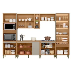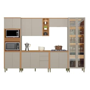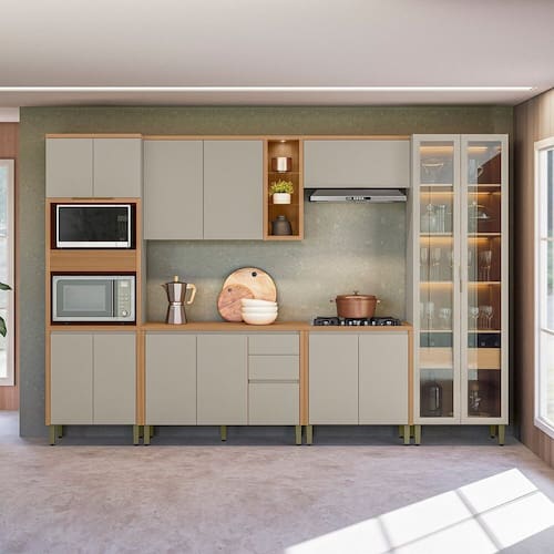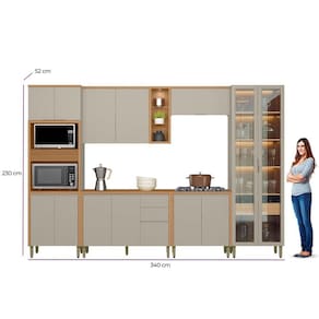 A Cozinha Allure, formada por 6 módulos, une elegância e praticidade em um só conjunto. Produzida totalmente em MDF, garante alta resistência e um acabamento impecável. Apresenta dobradiças com amortecimento, puxadores embutidos que valorizam o design, além de uma belíssima cristaleira com iluminação em LED e garrafeiro integrado. Conta ainda com torre com detalhe canelado e armário aéreo com nichos e spot de luz. Uma excelente opção para transformar sua cozinha em um ambiente sofisticado e bem organizado. Acabamento da Prateleira: Pintura Texturizada UV Escala de Brilho da Prateleira: Fosco Acabamento da Gaveta: Pintura Texturizada UV Escala de Brilho da Gaveta: Fosco Acabamento da Porta: Pintura Texturizada UV Escala de Brilho da Porta: Fosco Acompanha Rodapé Decorativo: Não Acompanha Tampo: Sim Altura dos Pés: 16,5 cm Altura Máxima dos Pés: 16.5000 Ambiente Principal: Cozinha Balcão Suporta Pia: Não codigo_ean: 7900288191670 Complexidade da Montagem: Média: pode ser montado por mais de uma pessoa e/ou necessite de maior conhecimento para montagem Cor: Jequitibá/Gris Fosco Cor do Produto: Jequitibá/Gris Fosco Cor Interna: Jequitibá Escala de Brilho: Fosco Espessura do Material da Estrutura: 15 mm Espessura do Tampo: 30 mm Gaveta com Chave: Não Itens Inclusos: 1 Cozinha Completa, Kit Ferragem e Manual de Montagem Linha ou Coleção: Allure Manual de Montagem e Instalação: https://product-hub-prd.madeiramadeira.com.br/209881494/documents/e5a3bdad-4c90-4e6a-bc3b-8eef27cccc743062952623117521740166443.pdf Marca: Linea Brasil Material da Corrediça: Metálica Material da Dobradiça/Corrediça da Porta: Metálica Material da Gaveta: MDF Material da Porta: MDF Material da Prateleira: MDF Material do Fundo: mdf Material do Tampo: MDF Material dos Pés: Plástico Medida de cada item (A x L x P): Torre Quente: 230x70x52,balcao: 89x120x52,aereo: 78x120x33,balcao: 89x80x52,aereo: 39x80x33,cristaleira: 230x70x52 modular: Sim Necessita Montagem: Sim O Balcão Acompanha Pia: Não Origem do Produto: Nacional Pés Reguláveis: Sim Peso: 241,45 kg Peso Máximo por Gaveta: 5 kg Peso Máximo por Prateleira: 5 kg Possui Pés: 17 Possui Portas: Sim Possui Prateleiras: Sim Possui recorte para Cooktop: Não Possui Rodízio: Não Possui Vidro: Sim Produto Montado: Sim Recomendações de Uso, Manutenção e Limpeza: Pano Seco Sapatas Niveladoras: Não Sistema de Montagem: Parafusos, Cavilhas e Minifix Tamanho Indicado da Pia: 120x52 Tipo de Corrediça da Gaveta: Metálica Telescópica Tipo de Dobradiça da Porta: Soft close Tipo de Dobradiça/Corrediça da Porta: Soft Close Tipo de Puxador da Gaveta: Embutido Tipo de Puxador da Porta: Embutido