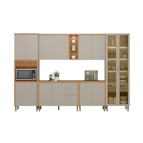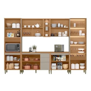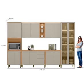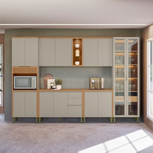 A Cozinha Allure, formada por 6 módulos, une elegância e praticidade em um só conjunto. Produzida totalmente em MDF, garante alta resistência e um acabamento impecável. Apresenta dobradiças com amortecimento, puxadores embutidos que valorizam o design, além de uma belíssima cristaleira com iluminação em LED e garrafeiro integrado. Conta ainda com torre com detalhe canelado e armário aéreo com nichos e spot de luz. Uma excelente opção para transformar sua cozinha em um ambiente sofisticado e bem organizado. Acabamento da Prateleira: Pintura Texturizada UV Escala de Brilho da Prateleira: Fosco Acabamento da Gaveta: Pintura Texturizada UV Escala de Brilho da Gaveta: Fosco Acabamento da Porta: Pintura Texturizada UV Escala de Brilho da Porta: Fosco Acompanha Rodapé Decorativo: Não Acompanha Tampo: Sim Altura dos Pés: 16,5 cm Altura Máxima dos Pés: 16.5000 Ambiente Principal: Cozinha Balcão Suporta Pia: Sim codigo_ean: 7900288191663 Complexidade da Montagem: Média: pode ser montado por mais de uma pessoa e/ou necessite de maior conhecimento para montagem Cor: Jequitibá/Gris Fosco Cor do Produto: Jequitibá/Gris Fosco Cor Interna: Jequitibá Escala de Brilho: Fosco Espessura do Material da Estrutura: 15 mm Espessura do Tampo: 30 mm Gaveta com Chave: Não Itens Inclusos: 1 Cozinha Completa, Kit Ferragem e Manual de Montagem Linha ou Coleção: Allure Manual de Montagem e Instalação: https://product-hub-prd.madeiramadeira.com.br/867408295/documents/6212a959-3f02-49b7-bafe-759d66671e823062590623117521698059037.pdf Marca: Linea Brasil Material da Corrediça: Metálica Material da Dobradiça/Corrediça da Porta: Metálica Material da Gaveta: MDF Material da Porta: MDF Material da Prateleira: MDF Material do Fundo: mdf Material do Tampo: MDF Material dos Pés: Plástico Medida de cada item (A x L x P): Torre Simples: 230x70x52,balcao: 89x120x52,aereo: 78x120x33,balcao: 89x80x52,aereo: 78x80x33,cristaleira: 230x70x52 modular: Sim Necessita Montagem: Sim O Balcão Acompanha Pia: Não Origem do Produto: Nacional Pés Reguláveis: Sim Peso: 254,91 kg Peso Máximo por Gaveta: 5 kg Peso Máximo por Prateleira: 5 kg Possui Pés: 17 Possui Portas: Sim Possui Prateleiras: Sim Possui recorte para Cooktop: Não Possui Rodízio: Não Possui Vidro: Sim Produto Montado: Sim Recomendações de Uso, Manutenção e Limpeza: Pano Seco Sapatas Niveladoras: Não Sistema de Montagem: Parafusos, Cavilhas e Minifix Tamanho Indicado da Pia: 120x52 Tipo de Corrediça da Gaveta: Metálica Telescópica Tipo de Dobradiça da Porta: Soft close Tipo de Dobradiça/Corrediça da Porta: Soft Close Tipo de Puxador da Gaveta: Embutido Tipo de Puxador da Porta: Embutido