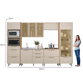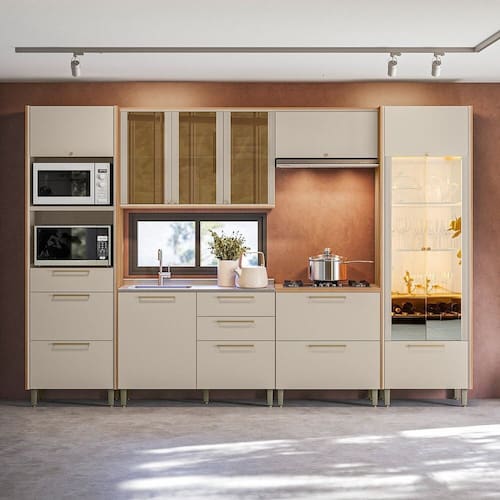 A Cozinha Atena é composta por 6 módulos que combinam perfeitamente design moderno e elegância. Produzida em 100% MDF, oferece alta durabilidade e um acabamento de qualidade superior. O projeto conta com dobradiças com sistema de amortecimento, além de um aéreo de 1,20m com porta de vidro reflecta e detalhe canelado, que adicionam um toque sofisticado ao ambiente. O conjunto inclui uma cristaleira belíssima, equipada com garrafeiro e iluminação em LED, além de uma torre funcional, ideal para quem precisa de mais espaço de armazenamento. Os módulos inferiores oferecem gavetas amplas, que garantem praticidade e organização no dia a dia. Uma escolha perfeita para quem procura uma cozinha funcional, charmosa e cheia de estilo.