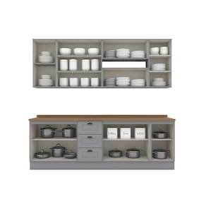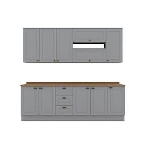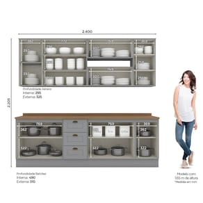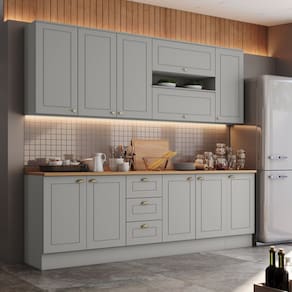 A Cozinha Completa 7 Peças 100% MDF com Tampo Internacional apresenta corrediças telescópicas, é fabricada 100% em MDF e possui dobradiças metálicas de 35 mm com amortecimento. Seus puxadores em metal Zamac na cor ouro velho adicionam um toque de elegância vintage. É uma escolha que une praticidade, durabilidade e estilo contemporâneo. Acabamento da Prateleira: Pintura Texturizada UV Escala de Brilho da Prateleira: Fosco Acabamento da Gaveta: Pintura Texturizada UV Escala de Brilho da Gaveta: Fosco Material do Puxador da Gaveta: Metal Acabamento da Porta: Pintura Texturizada UV Escala de Brilho da Porta: Fosco Material do Puxador da Porta: Metal Acompanha Tampo: Sim Ambiente Principal: Cozinha Complexidade da Montagem: Média: pode ser montado por mais de uma pessoa e/ou necessite de maior conhecimento para montagem Cor: Cinza/Marrom Cor do Produto: Cinza/Marrom Cor Interna: Trama Escala de Brilho: Fosco Espessura do Material da Estrutura: 15 mm Espessura do Tampo: 25 mm Gaveta com Chave: Não Itens Inclusos: 1 Cozinha Compacta e Manual de Montagem Linha ou Coleção: Internacional - Henn Manual de Montagem e Instalação: https://product-hub-prd.madeiramadeira.com.br/925052/documents/15aedb45-7de4-4d89-89b7-a4804ccdf0212160694432517216721423195.pdf Material da Dobradiça/Corrediça da Porta: Metálica Material da Gaveta: MDF Material da Porta: MDF Material da Prateleira: MDF Material do Fundo: MDF Material do Tampo: MDF Material dos Pés: MDF Medida de cada item (A x L x P): Aéreo: (AxLxP) 83cm X 120cm X 32,5cm, Balcão: 82cm X 120cm X 51cm, Aéreo: 34cm X 80cm X 32,5cm, Aéreo: 34cm X 80cm X 32,5cm, Balcão: 82cm X 80cm X 51cm, Aéreo: 83cm X 40cm X 32,5cm, Balcão: 82cm X 40cm X 51cm Necessita Montagem: Sim O Balcão Acompanha Pia: Não Origem do Produto: Nacional Pés Reguláveis: Não Peso: 169 kg Peso Máximo por Gaveta: 3 kg Peso Máximo por Prateleira: 8 kg Possui Pés: Rodapé Possui Portas: Sim Possui Prateleiras: Sim Possui recorte para Cooktop: Não Possui Rodízio: Não Possui Vidro: Não Recomendações de Uso, Manutenção e Limpeza: Para limpeza de seu móvel, use uma flanela limpa e seca. Não utilize produtos químicos que possam danificar o produto. Sapatas Niveladoras: Não Sistema de Montagem: Parafusos e Cavilhas Suporta Até (kg): 100 kg Tamanho Indicado da Pia: (L x P) 120 x 53,5cm Tipo de Corrediça da Gaveta: Metálica Telescópica Tipo de Dobradiça da Porta: 35 mm Tipo de Puxador da Gaveta: Externo Tipo de Puxador da Porta: Externo